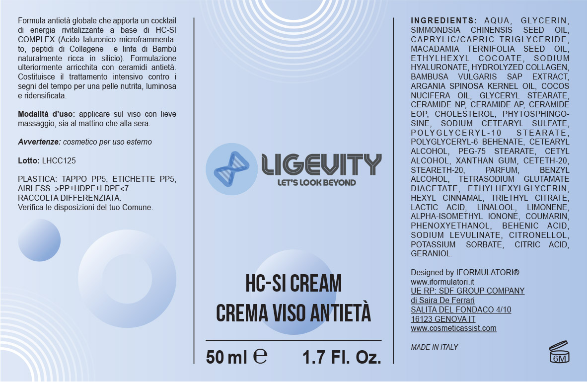 Formula antietà globale che apporta un cocktail di energia rivitalizzante a base di HC-SI COMPLEX (Acido Ialuronico microframmentato, peptidi di Collagene e linfa di Bambù naturalmente ricca in silicio). Formulazione ulteriormente arricchita con ceramidi antietà. Costituisce il trattamento intensivo contro i segni del tempo per una pelle nutrita, luminosa e ridensificata. Prodotto Cosmetico per uso esterno.